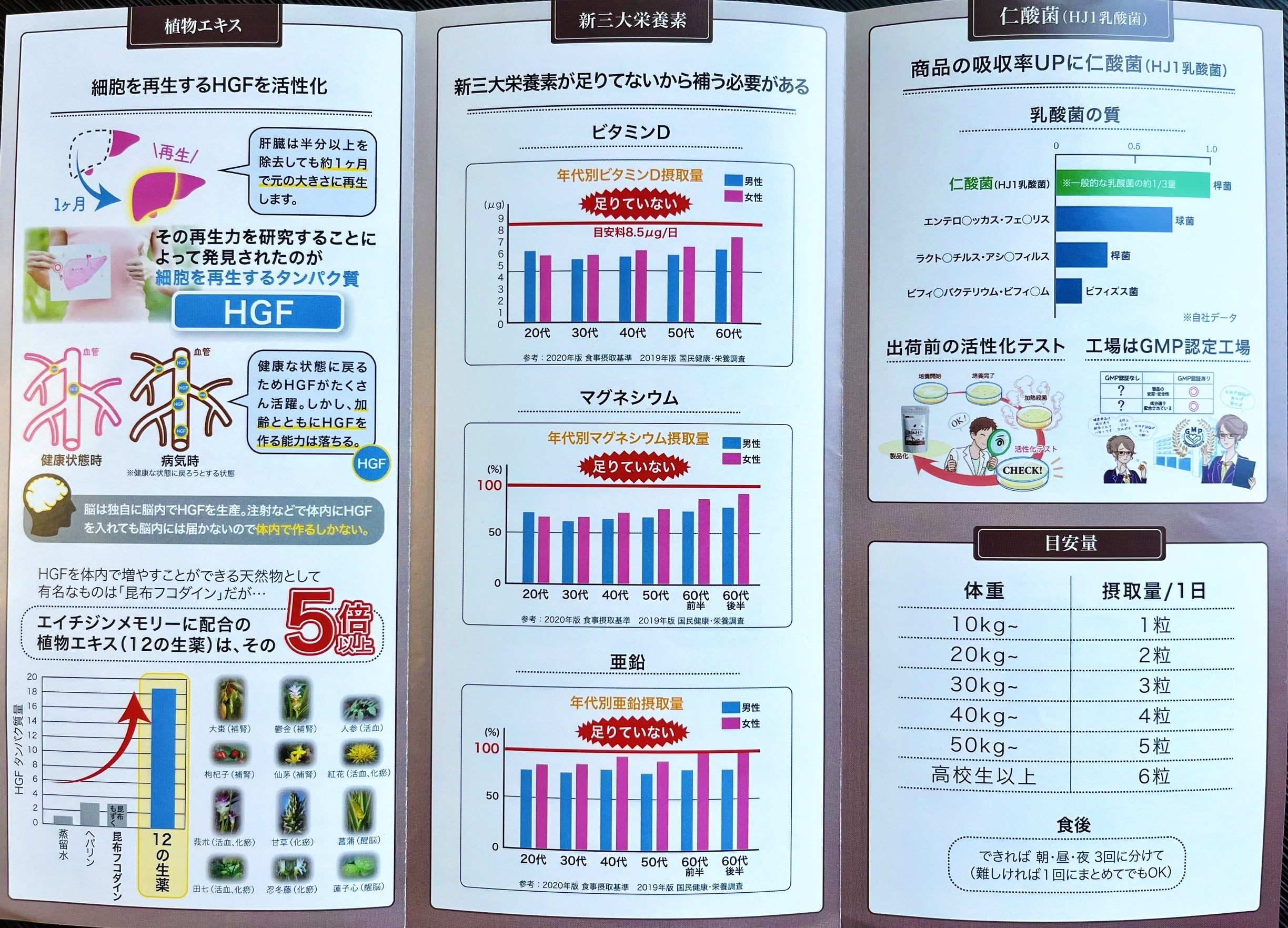 【原材料名】植物エキス(クコの実、スイカズラ、セキショウの葉、ガジュ ツ、キンバイザサ、ベニバナ、秋ウコン、田七人参、高麗人参、 ハスの胚芽、ナツメ、カンゾウ)(国内製造)、亜鉛含有酵母、 乳酸菌(加熱菌体・デキストリン)/セルロース、酸化マ グネシウム、ステアリン酸カルシウム、ビタミンD